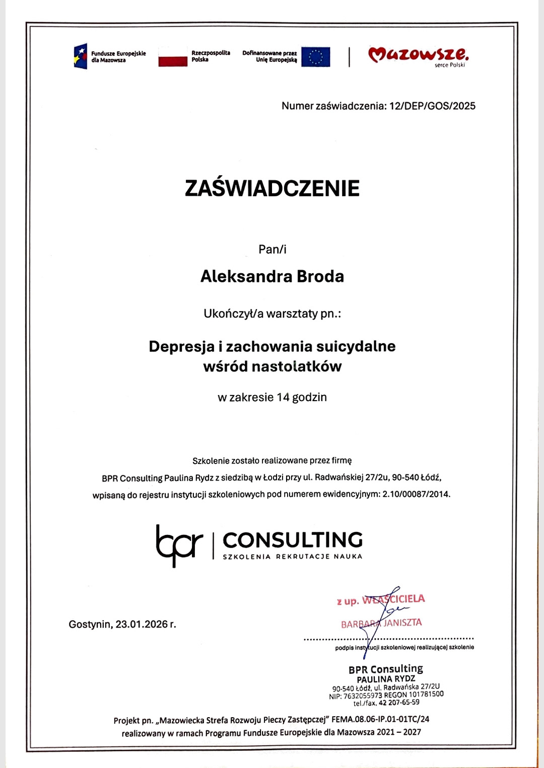 Jestem psychoterapeutką Gestalt w trakcie szkolenia w Szkole Psychoterapii Gestalt w Warszawie, posiadającej
